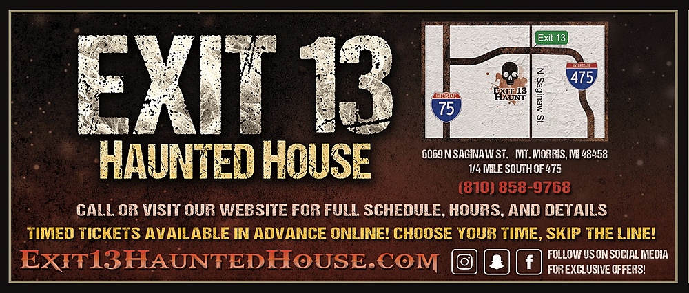 “10” Years in the making for you. All New for 2022! You voted EXIT 13 HAUNTED HOUSE the BEST in Genesee County. Come & see what we have for you. It’ll make you scream with fright & run from the terror of the night. Come see us if you dare, we’re here to make you scream with fear from what you keep within.