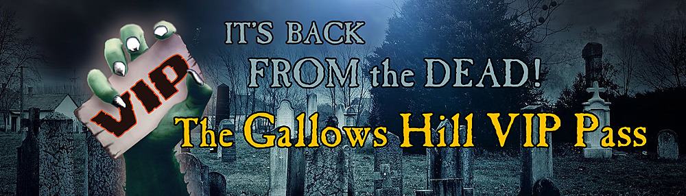 Coming on a busy Saturday or Sunday? Wanna skip the line? Well, the Gallows Hill VIP Pass is back from the dead to grant your wish. VIP ticket holders will be able to see the Gallows Hill Main Show and The Lost Museum without waiting! Tickets are general admission. Children 6 years and under are free.