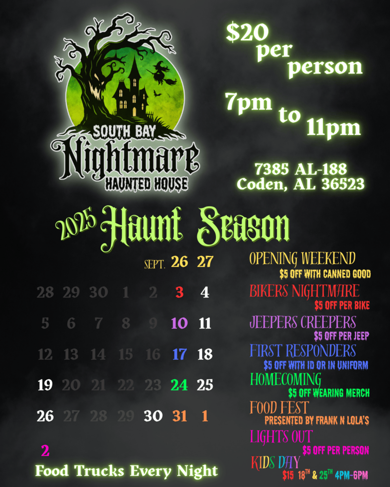 The South Bay Nightmare Haunted House is back—and this year, the scares are bigger, bolder, and more twisted than ever! Prepare yourself for an immersive, heart-pounding journey through a world of nightmares brought to life. Every shadow hides a surprise, every corner may hold something you never imagined… and nothing is what it seems.