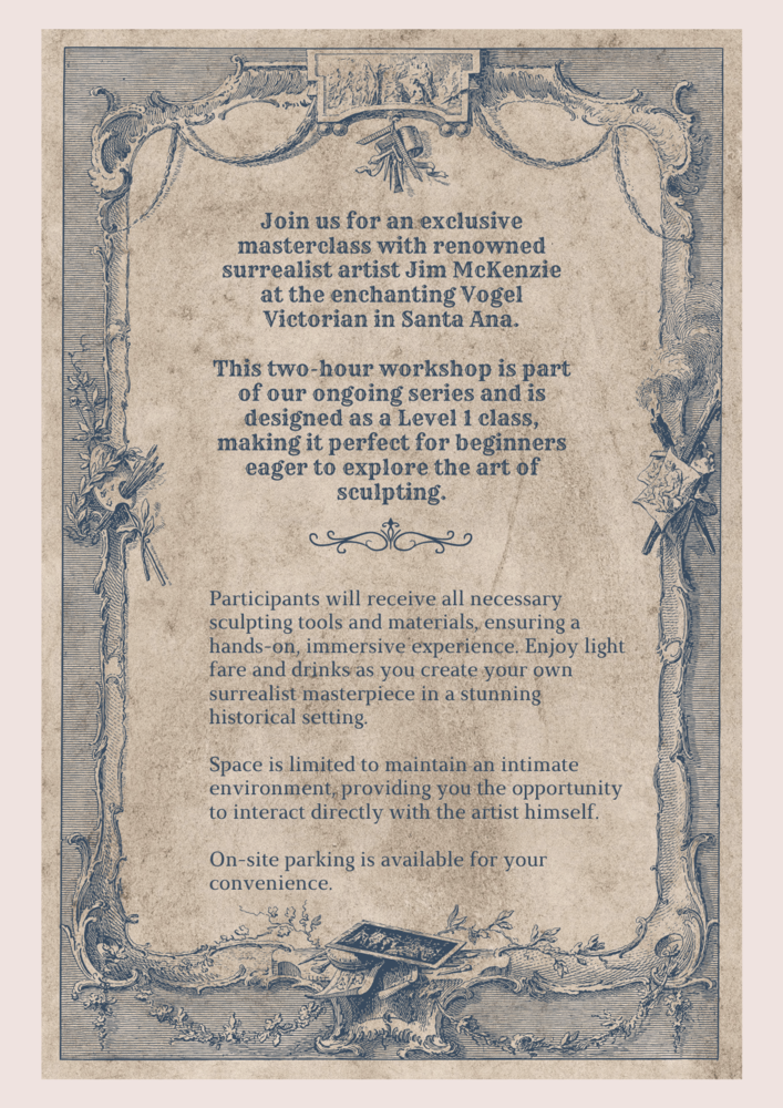 Step into the enchanting world of surrealism with Jim McKenzie's exclusive sculpting masterclass. Join us for a 2-hour workshop where you will receive personalized instruction, sculpting tools, and materials to bring your imagination to life. Enjoy a delightful array of light refreshments and drinks as you dive into the realm of surrealism. This is a LEVEL ONE class which is suitable for beginners.