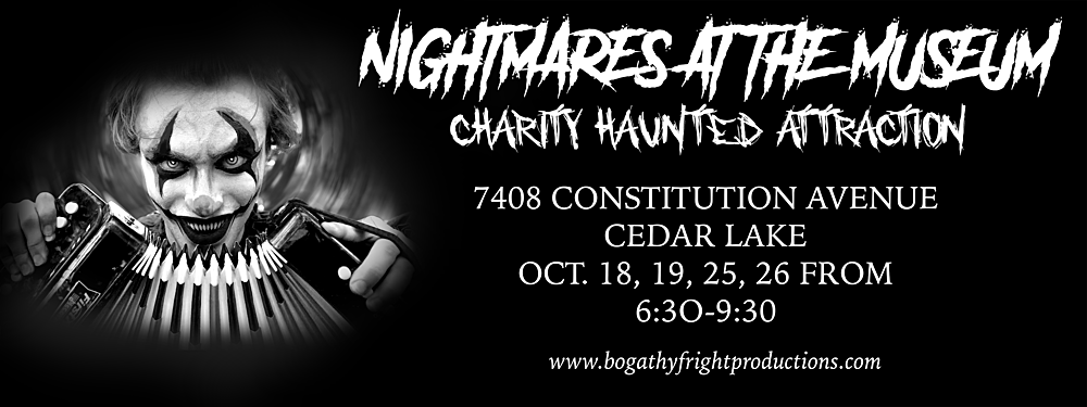 Come enjoy scares, chills, fun, and seasonal haunted entertainment! The Cedar Lake Historical Association has partnered with Bogathy Fright Productions volunteer group to bring a truly unique and entertaining haunt experience to the town grounds. "Nightmares at the Museum" will be open October 18, 19, 25, and 26 from 6:30-9:30PM. (Last tickets sold at 9:30) Choose from General Admission for $10 per person or VIP Fast Pass for $2o per person to skip the waiting line. The attraction will operate in the CLHA Museum, adjacent to town hall and the police station. Contact the Cedar Lake Historical Association with questions at www.cedarlakehistory.org, 219.390.9423 or [email protected]. Bogathy Fright Productions Volunteer group has been scaring Northwest Indiana since 2009.