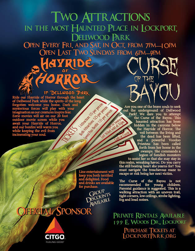 Curse of the Bayou: Are you one of the brave souls to seek out the underground of Dellwood Park? We dare you to attempt the Curse of the Bayou. This haunted attraction has been hidden in the canyons below the Hayride of Horror. The veil between the living and the dead has been lifted, and a powerful Voodoo Priestess has been called forth from her home in the swamps. She commands a legion of fiendish monsters to assist her so that she may stay in this realm, wreaking havoc. Do you carry the still beating heart she yearns for? You must navigate the treacherous maze to escape, or risk being her next victim.