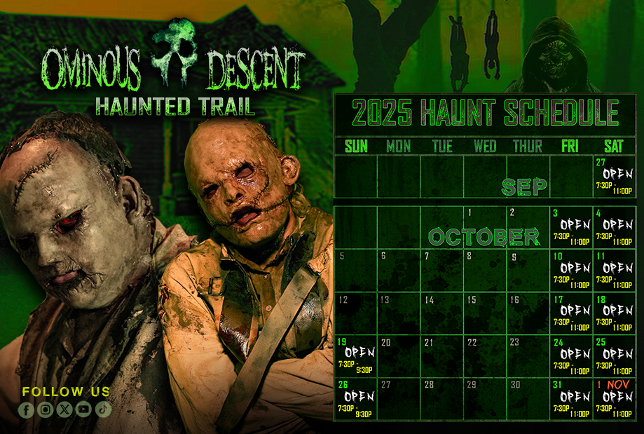 Risks may include: slipping, falling, collision with fixed objects or other participants, bruises, twists, sprains, breaks, seizures, and possibly death. By reading this warning, you understand that such risks are to be expected when entering any haunted attraction, including Ominous Descent. These risks cannot be eliminated without jeopardizing the essential qualities of this activity. By purchasing a ticket to Ominous Descent Haunted Trail it is expressly understood that you have been made aware of these risks and you agree to assume all the risks existing in this activity. Your participation is purely voluntary and you elect to participate in spite of the risks. We reserve the right to eject or refuse admission to any person; no refund will be given.