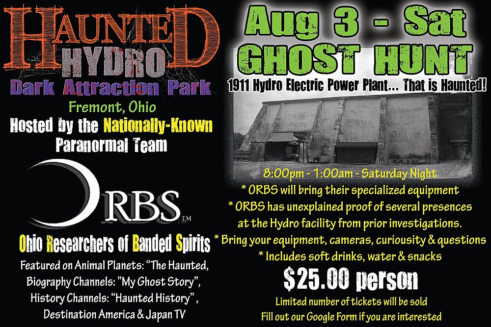 Do you have cabin fever? Its time to get out and have some real fun. Do you believe in ghosts...Well here is your chance to go on a real ghost hunt which will be hosted by ORBS Ohio Researchers of Banded Spirits paranormal team which has been featured on many different TV shows newest being Haunted Case Filed on Travel Channel. You will be locked in one of Fremont's haunted buildings the Haunted Hydro. Yes this a haunted house during the Halloween season but it's really a haunted location. There are several documented deaths that happened here and workers see many shadow people they won't work in some areas, there is a spirit of a girl seen walking the building many voices can be heard which creeps the employees out. Now you can experience this place for yourself on August 3rd from 8pm to 1am tickets are $25 per person. Only 30 tickets will be sold.