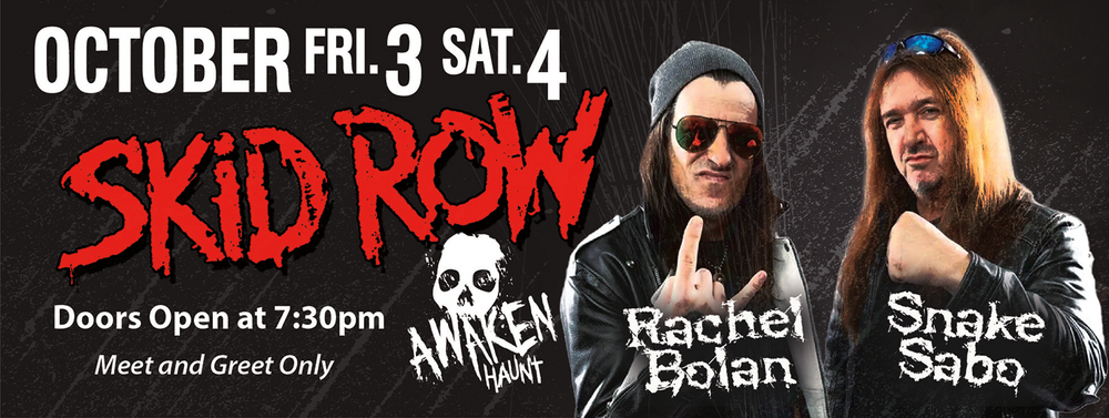 Horror and rock music have a strong connection rooted in a shared appreciation for darkness, rebellion. Haunted Houses have used rock music to generate excitement in advertising, queue lines and more and rock bands have used horror to create music videos, album art and stage shows. Awaken wanted to bring these together in a different way with a meet and greet. We are kicking it off with founding members of Skid Row bassist and main songwriter Rachel Bolan and Guitarist Dave "Snake" Sabo Oct. 3rd and 4th at Awaken Haunted Attraction. They will sign autographs, take photos and also have merchandise.*