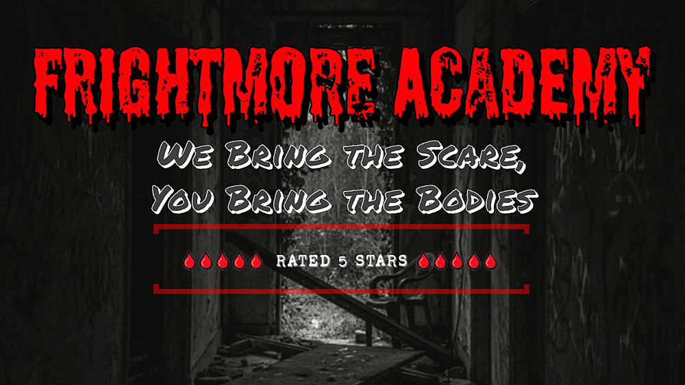 Frightmore Academy is a haunted house which includes 20+ different scenes, both indoor and out. It is not recommended for the faint of heart or those suffering from heart and/or breathing conditions. Visitors will be exposed to strobe lights, fog, and loud noises.