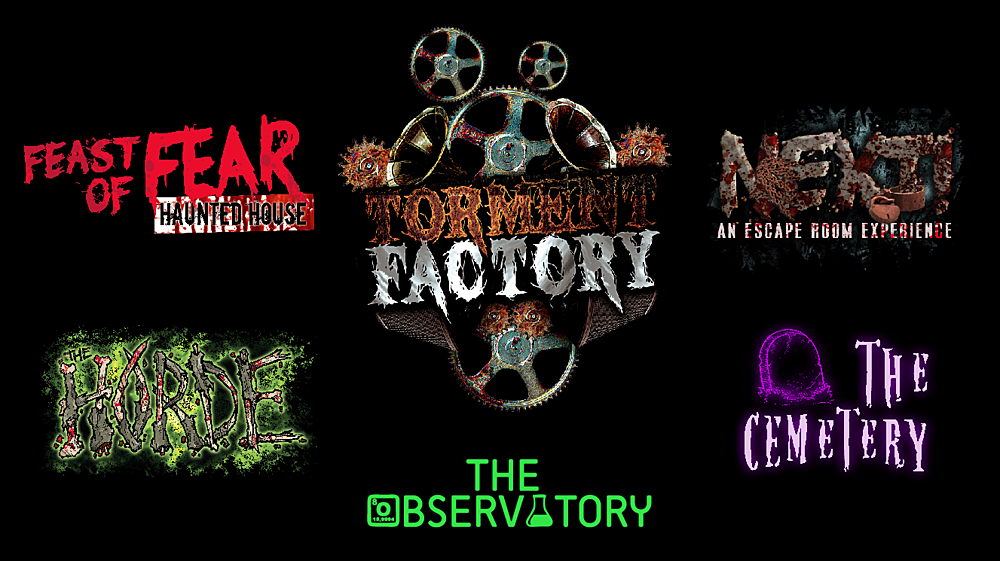Gainesville's premier source for live Halloween entertainment featuring Feast of Fear - the largest and best-acclaimed live-actor haunt in the area, NEXT! - a haunted escape-the-room experience, The Horde - a zombie apocalypse themed maze-style haunt, The Cemetery - a halloween themed "midway" full of scare zones and halloween attractions for all ages, and The Observatory, a Halloween + Mad Science themed private event space for groups of 30 to 300!