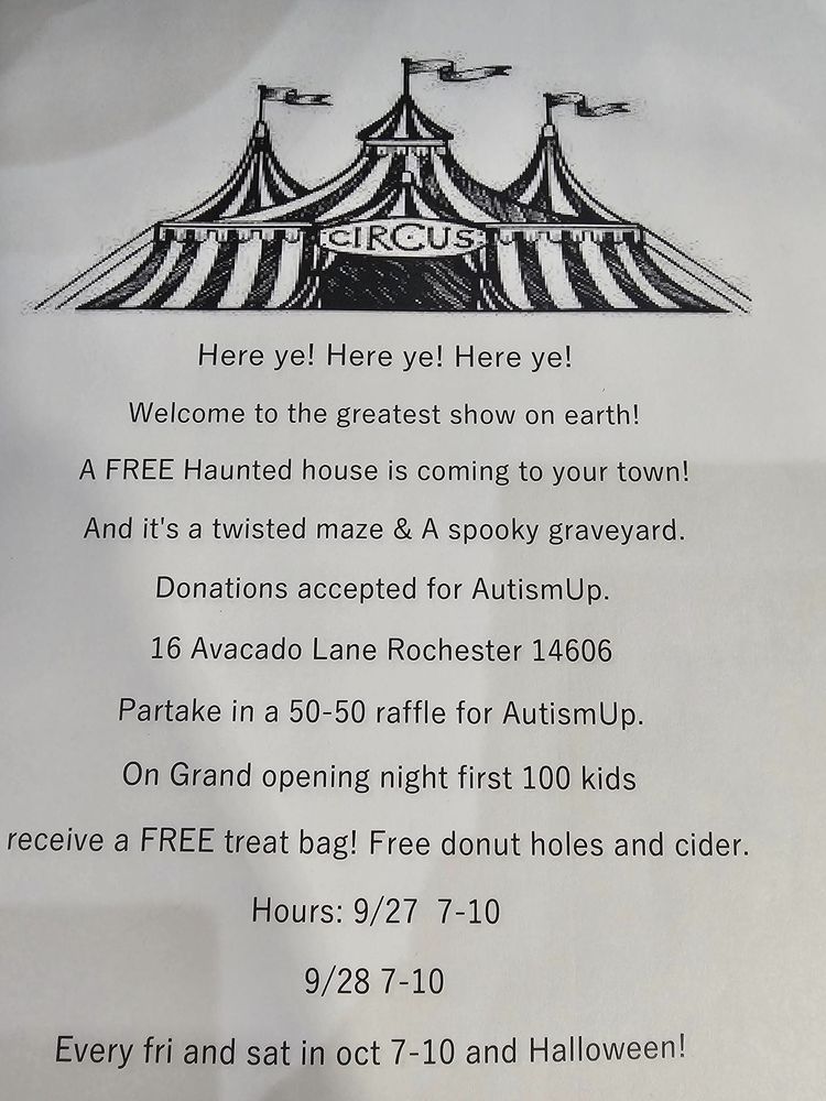 Come one, come all to Insomnia House, a FREE haunted attraction that will send shivers down your spine! While we accept donations for AutismUp, you'll also have the chance to participate in our 50-50 raffle benefiting this great cause. Indulge in delicious free dount holes and cider on opening night, and satisfy your sweet tooth with our cotton candy for only 2.50 a piece (proceeds go to AutismUp). Get ready to be bewitched as you explore a 120 ft blacklit maze filled with twists and turns. Choose between 3 levels of fear! Easy, medium and hard! Listen to chilling ghost stories as you wander through spooky acres cemetery. We are open every Friday and Saturday in October, except for October 19th when we are closed for a private event.